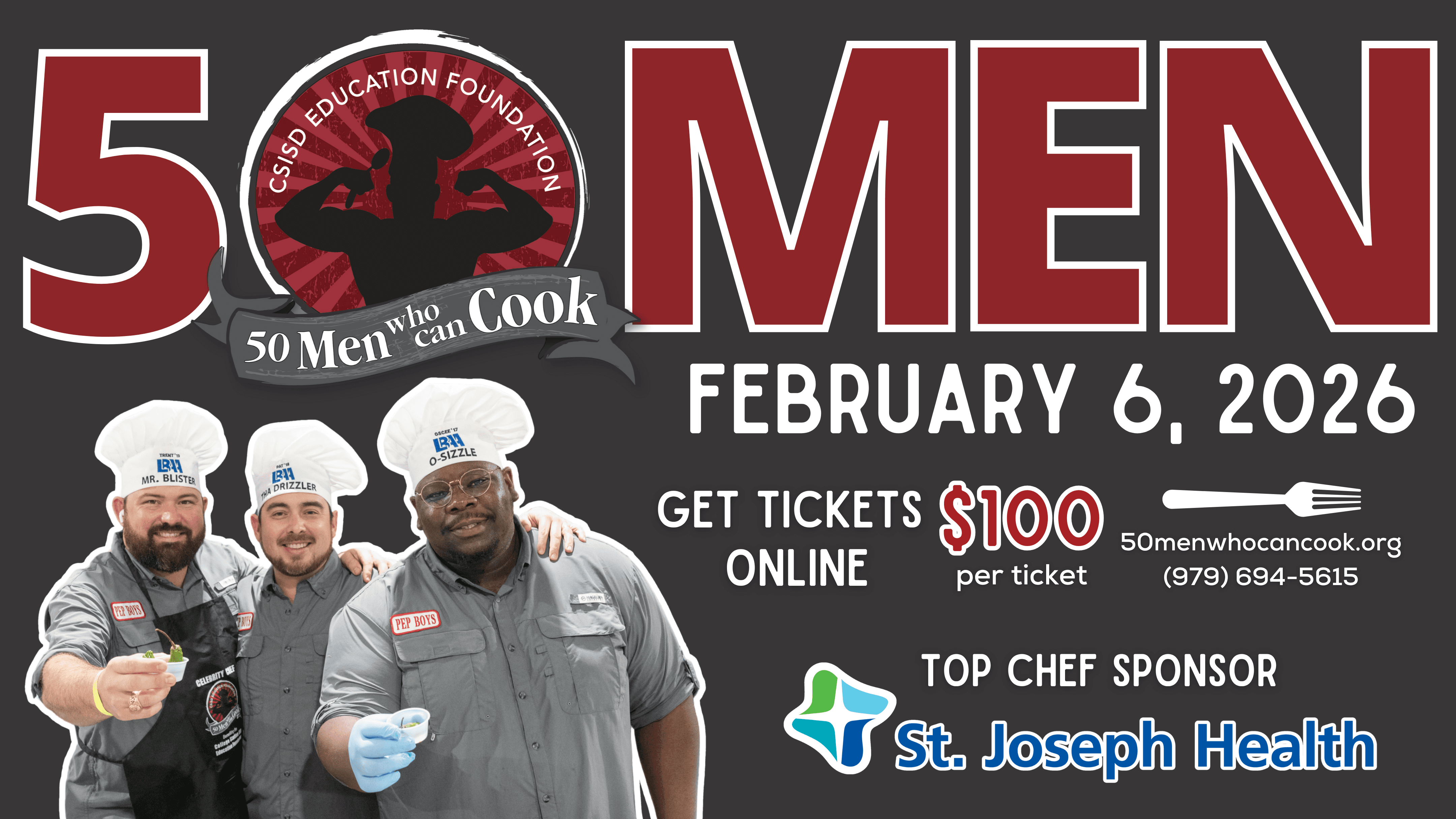 Join us for 50 Men Who Can Cook 2026 on Friday, February 6, 2026! Eat, drink and GIVE to CSISD Kids while tasting great food from 50+ Celebrity Chefs. Lots of food, drinks, games and fun for a great cause!